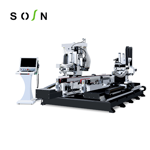 功能:門扇鎖、合頁等五金件安裝孔、槽的加工。特點:自動對刀功能,保證換刀,斷刀更換時的加工精度。 主軸正反旋設(shè)計銑削,確保加工不崩邊,崩角,提高加工質(zhì)量。 門扇鎖孔,合頁兩側(cè)同時加工,提高生產(chǎn)加工的效率。 真空吸附平臺,自動測寬,測厚功能,滿足不同寬度,厚度門扇的精確